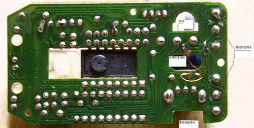 按圖1所示,在線路板上找到左右鍵微動開關在電路板上連接至控制芯片的信號線,將它們用小刀割斷,然后將兩個微動開關至控制芯片的接線對調,即按圖中虛線所示接兩根短線(這里用的是漆包線)即可。本人分別按此法改過兩個鼠標(光電、機械各一個)均已成功。