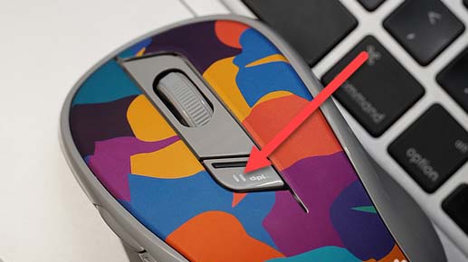 3、長按鼠標背面“藍牙”按鈕,進入配對狀態。(M500可以接入三臺設備,每臺設備都配對成功后,短按此按鈕,可以在不同設備之間切換)