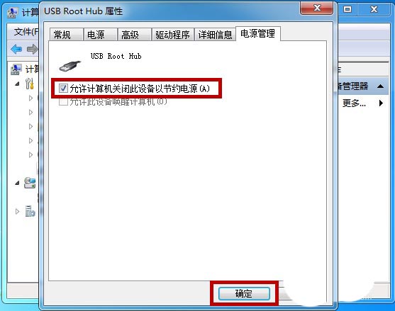 7、然后在電源管理中把【允許計算機關閉此設備以節約電源】選項給去掉,然后點擊【確定】。