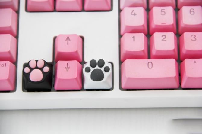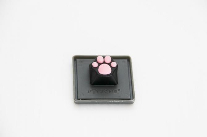 這三顆貓爪鍵帽和之前的吃雞三件套鍵帽不同,吃雞三件套的鍵帽形狀并不是那么的規則,并且高度也不一樣,如果當作常用按鍵來按的話手感總會有些怪怪的,比較適合放在不常用的鍵位做裝飾用。而這三顆貓爪鍵帽整體造型比較規整,而且高度和普通鍵帽大致相當,所以就算是放在常用按鍵上也不會影響手感。并且貓爪上的硅膠按上去軟綿綿的,感覺非常奇妙。