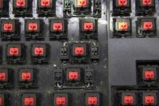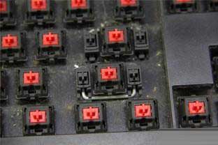 在黑底鍵盤拆卸后,我們可以看到隱藏在鍵帽底下的布滿灰塵PCB板。仔細分辨,這些灰塵和雜物,幾乎都是頭發絲或是碎屑之類的雜物,還有很大部分的自然劃痕。