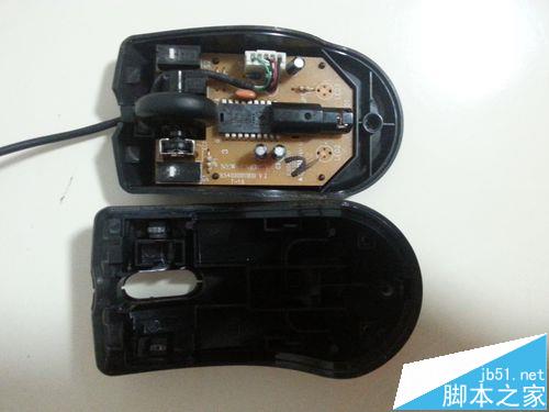 2、將鼠標殼后部略微打開,此處采用了卡扣,需將前殼向前 后殼向后縮動就可以將上殼與下殼分離,分離后如圖所示