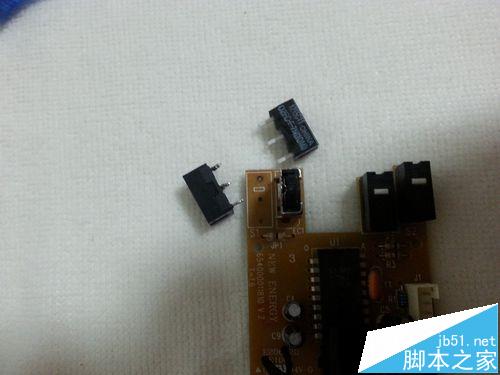 4、此時可以看見三個鼠標的微動,分別為 左鍵 右鍵 和 滾輪鍵,用電烙鐵將微動的焊錫融化,用吸錫器將融化的焊錫去除然后取下舊的鼠標微動,之后用同樣的方法將新微動裝上,添加焊錫,焊錫的具體使用方法可百度~