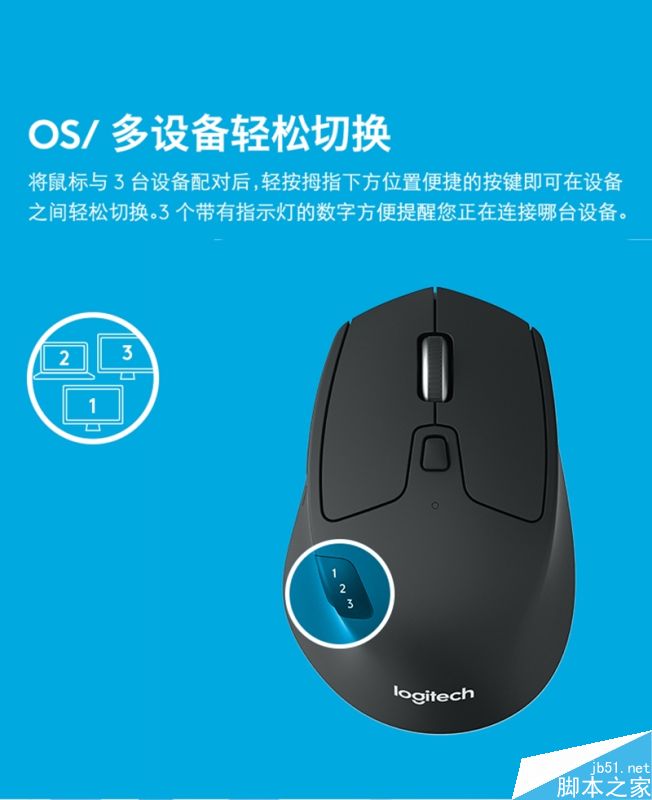 ↑↑↑切換鍵的正上方顯示著目前連線的設(shè)備是哪一個(gè),羅技M720目前最多可與3臺(tái)設(shè)備配對(duì),且各個(gè)設(shè)備之間可輕松切換。