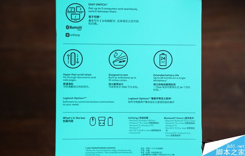 ↑↑↑包裝背面介紹了羅技M720的特點(diǎn),除了多屏協(xié)作外,持久的電池續(xù)航也是這款鼠標(biāo)的重要特點(diǎn)。