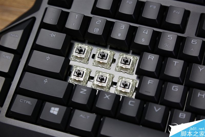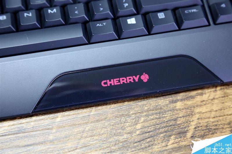 鍵盤上蓋(下蓋也是)為鋼琴黑質(zhì)感,并做了磨砂處理。一體式卡托中央位置還有一段做了亮漆,上有Cherry LOGO——官方并不認(rèn)為這部分是掌托。