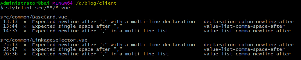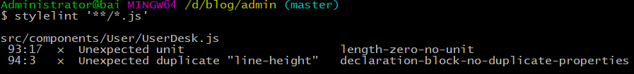 {"processors": ["stylelint-processor-styled-components"],"extends": ["stylelint-config-recommended","stylelint-config-styled-components"],"plugins": ["stylelint-order"],"rules": {"order/order": ["declarations","custom-properties","dollar-variables","rules","at-rules"],...}3、同樣地,使用stylelint命令即可校驗
