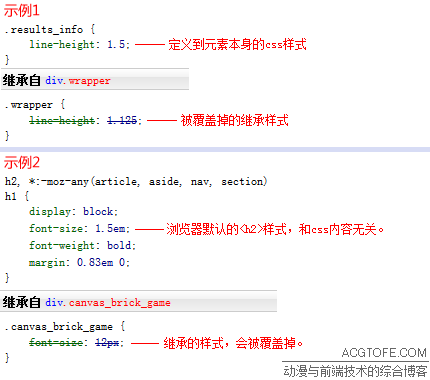 圖中由前端調試工具所顯示的,被劃掉的css樣式,不會呈現在這里選中的網頁元素上,因為它們被覆蓋掉了。css優先級,就是指在這種情況下,得出“應該由哪一條樣式規則的內容覆蓋掉其他的”這個結論的過程中所遵循的原則。更一般的表述是,優先級高的css樣式,將覆蓋優先級低的css樣式,成為最終網頁元素的實際樣式。