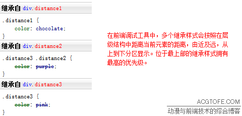 當一個元素有多個父級元素都定義了繼承樣式,這些繼承樣式之間的優先級又是怎樣的?這時候,遵循的優先級原則可以叫做就近原則,也就是說,在存在多個繼承樣式時,層級關系距離當前元素最近的父級元素的繼承樣式,具有相對最高的優先級。同樣,這時候也是無視樣式規則內容的。