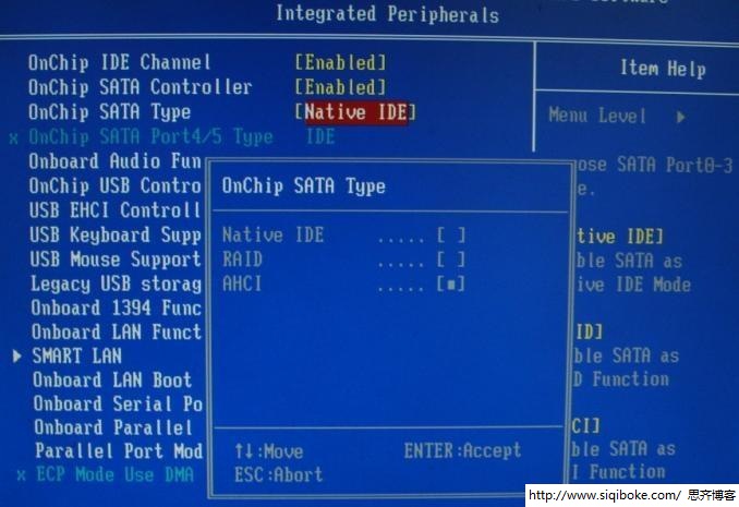 硬盤的AHCI模式的設置位置一般在Integrated Peripherals集成設備界面里,首先選擇OnChip SATA Type,接著可以看到下面的三個選項,Native IDE/RAID/AHCI,如果需要關掉AHCI,則選擇Native IDE即可,開啟則選擇AHCI。有些筆記本上可能只有AHCI和ATA還有DISABLE選項,可以選擇ATA模式也可以。還有顯示Compatible Mode兼容模式的,意思也是Native效果相同。
