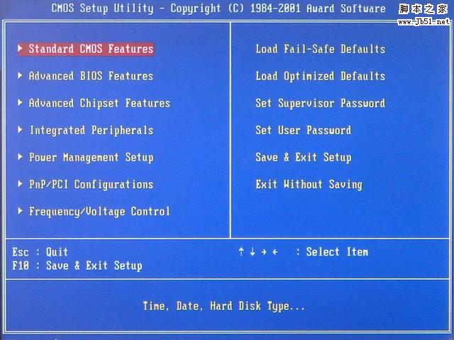 在主菜單中用方向鍵選擇“Standard CMOS Features”項然后回車,即進入了“Standard CMOS Features”項子菜單如下圖3