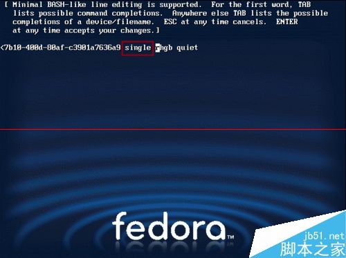 4、進入編輯界面之后,使用左右鍵將光標轉到“rhgb quiet”之類的字符前面,輸入“single”加空格,或者輸入“1”加空格,完成之后按回車鍵,就可以,返回上一步中啟動命令行菜單。