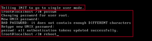 6、設置完密碼,輸入“reboot”命令重啟計算機就大功告成了。作為對比,下圖是在上述第“4”步中輸入了“1”時的顯示效果。
