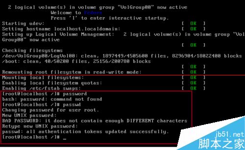 5、返回命令行啟動菜單之后,按“b”鍵,就可以以單用戶模式啟動操作系統了。操作系統啟動之后,會直接進入單用戶模式,不需要再輸入任何登錄密碼。這時我們就可以使用“passwd”命令重新設置root密碼了。