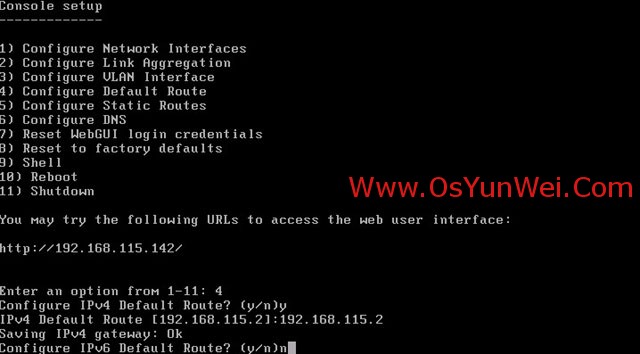 4)配置默認路由:用來設置默認網關的IPv4或IPv6。出現提示時,輸入默認網關的IP地址。