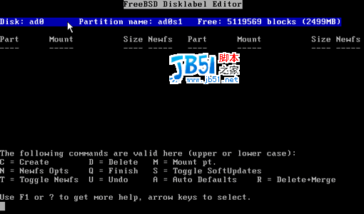 這是FreeBSD的FDISK Partition Editor,第2行顯示的是VMware存放FreeBSD目錄所在Win2K里面的分區大小,可以看到是4G左右的空間,因為我這是測試用的,就使用整個分區來安裝FreeBSD的話,按A,使用整個分區,如果你不想使用整個分區的話,按C來定制分區,可以直接輸入M為單位的,按D刪除當前分區,Q鍵是保存分區,手動分區的話,分區類型選擇默認的165 ,直接回車就行了。