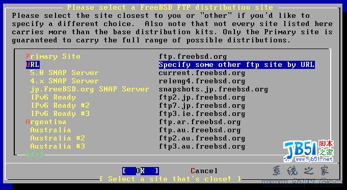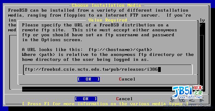 我們選擇「URL」來自訂要使用的 FTP 站臺。接著便會出現(xiàn)一個要求我們輸入站臺地址的窗口,如圖 10-5 所示,假設(shè)我們要使用交大資工的站臺,則輸入 freebsd.csie.nctu.edu.tw/pub/releases/i386/: