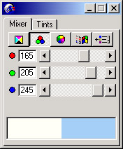 接下來是上色,點擊矩形行使之被選中。分別單擊Window菜單>Panels>Color Mixer和Color List命令,調出調色板和顏色列表兩個面板(您也可以用快捷鍵Ctrl+Shift+9和Ctrl+9調用它們)。在調色板面板(Color Mixer)的Mixer子面板中選擇RGB配色方案,分別設定R=165(紅),G=205(綠),B=245(藍),如圖十四所示,我們得到了實例中的那個較深的天藍色。然后把這個顏色從預覽框拖到Color List面板中Color子面板的新色框