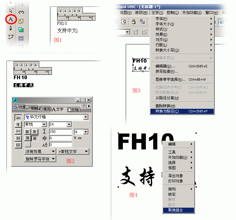圖5)這時“FH10”和“支持中文”相互獨立,把后者調得稍大一些,再使前者有一個角度,方法很簡單,在對象上雙擊會在其四邊出現出現八個黑粗的控制點,鼠標放在點上可進行拖拽式縮放,鼠標放在點外可進行旋轉。注意,八個控制點的中心有一朵小黑花,那是縮放和旋轉的基點,可以自由安排其位置。這一步很簡單,再用圖示顯得太羅嗦,大家自己試試吧。這功能非常常用,以后的例子里也要用到的。