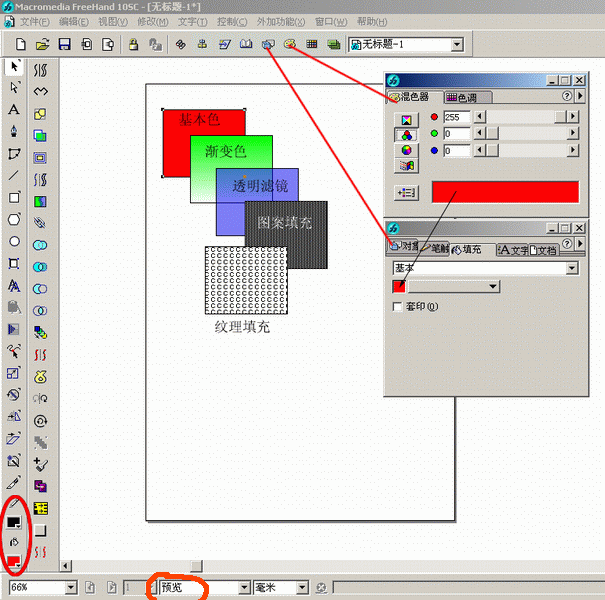 首先必須要認識兩個面板:混色器和填充面板,下圖上的兩條紅線表示點擊主工具欄上的那兩個圖標即可將這兩個面板顯示或隱藏(填充面板是和對象面板在一起的,其實主工具欄上的圖標是調出對象面板,你須要再點“填充”標簽一次)。混色器上有一條黑色指向了填充面板的一個色塊,這是說你把混色器里選好的顏色拖到填充面板的色塊上,即可改變對象顏色。填充面板里有多種填充模式可選,我列舉了五種。你要注意我在圖下方畫了紅圈--預覽,如果你用了其它的視圖模式比如“flash抗鋸齒”,你就看不到后兩種填充效果了。