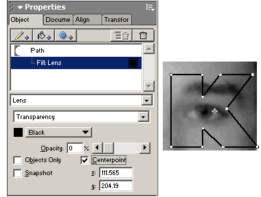 步驟三:現在選擇字母k,對它應用濾鏡填充,采用透明填充,將不透明度設為 0 ,打開中心點的顯示,會有一個標記顯示在字母的中心位置上,如上圖所示。但不要打開 Snapshot ,它會打斷濾鏡采樣中心點和它下方對象之間的聯系。