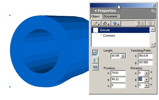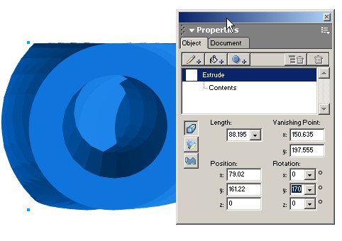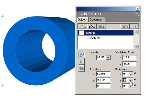 現在我們要來讓這個立體的圓柱體給轉起來,操作非常的簡單,只不過過程有些多,是這樣的。在Object面板中,設置Extrude的Rotation參數的Y數值為10°,當然你也可以設置X和Y的度數,這都沒有關系的。現在我們可以看到這個立體對象在Y軸上旋轉了10度。