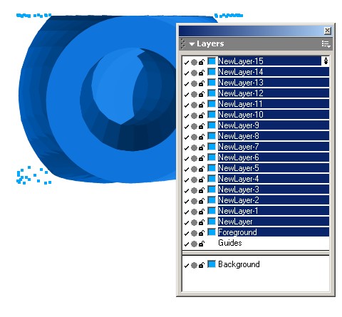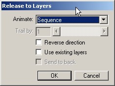 Ctrl+A全選這些圓柱對象,使用菜單命令:Modify>Group將它們成為一個組對象,此時這個組對象處于被選擇狀態時,選擇菜單命令:Xtras>> Animate > Release to Layers(釋放到層)。當Release to Layers 窗口被打開時,我們不需要調整什么,一切按照默認的設置,點擊OK按鈕,完成操作。