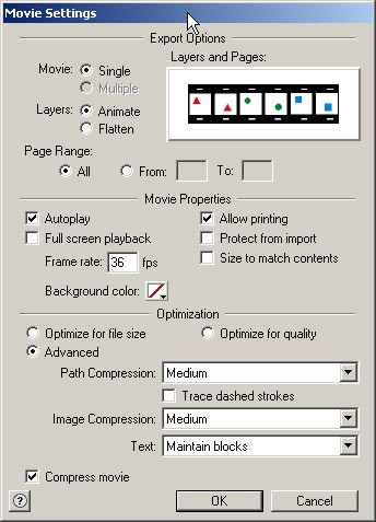 點擊Flash預覽窗口下面最右邊的第二個按鈕我們就可以非常快速地輸出這個SWF文件,最右邊第一個按鈕是用來設置Flash電影的一些參數,比如說是不是自動播放,每秒多少幀等一些至關重要的參數,如下圖所示窗口。