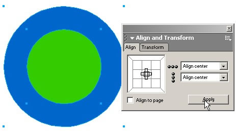 使用菜單命令:Window>Align,打開Aligh窗口,全選這二個圓形對象,在Align面板中設置水平和垂直的排列方式都為Align center(居中排列)然后點擊一下Apply按鈕,如下圖所示,這樣這二個圓形對象就能以中心點對齊了,成為一組同心圓。