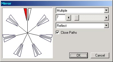 框中分別看到它們的效果,這里我們介紹一下Multiple(多重鏡像)的使用方法。如圖七,選項框下面是一個設置復制鏡像數目的拖動條,您可以嘗試點擊拖動條兩側的按鈕——是不是有驚奇的發現呢?再下面的下拉式選項框提供Reflect(旋轉)與Rotate(對稱)兩種選擇。