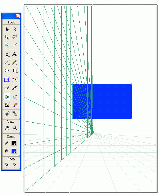 首先選擇菜單view/Perspective grid/show命令,顯示透視網格,如圖。畫一矩形,然后選擇工具欄里的透視工具,如圖中工具欄里凹下去的圖標即是。這時如果你以透視工具點選矩形并移動,效果與“選擇工具”無異,只會使矩形移動其平面位置。