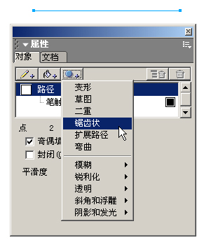 1 、第一步我們先來創建一條曲線,使用工具面板中的直線工具按住Shift鍵繪制一條水平的直線,然后打開對象面板,如圖2所示。點擊面板上面第三個小按鈕(添加效果按鈕),此時會出現一垂直的菜單,我們選擇鋸齒狀選項(在接下來的教程中我們通過添加XX效果這一表述方式,而不給出具體的下拉菜單選項)。