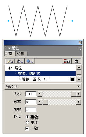 2 、選擇鋸齒狀選項后,我們在對象面板下面的屬性窗口中設置它的一些參數。設置大小為100,頻率為4,份數為1。外緣選項中我們勾選“一致”這個選項,就得到如圖3所示的尖銳的波形圖。