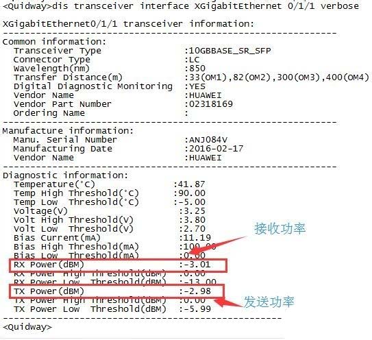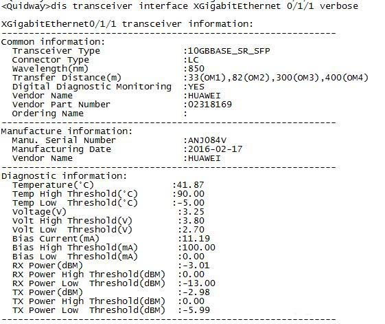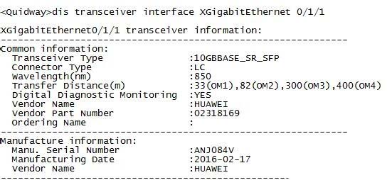 3、我們用命令“dis transceiver interface XGigabitEthernet 0/1/1 ”可以查看設備端口上的光模塊的常規、制造、告警信息。