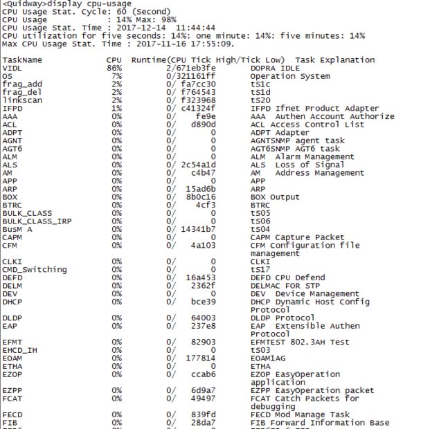 5、查看cpu狀態,可以用命令display cpu-usage。各模塊的CPU占用率正常。如果出現CPU占用率長時間超過80%或者頻繁出現超過80%的情況,建議重點關注。