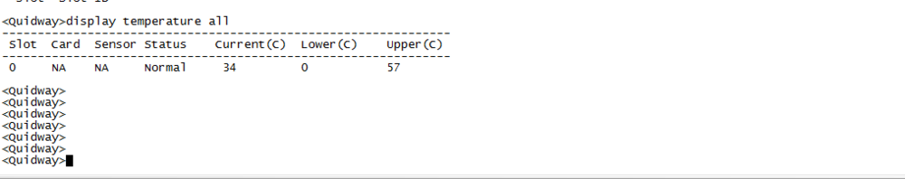 3、查看設備溫度,可以用命令display temperature all。各模塊當前的溫度應該在上下限之間,即“Current”的值在“Lower”和“Upper”之間。