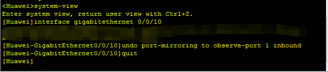5、刪除端口鏡像。在鏡像端口下執行命令undo port-mirroring,刪除觀察端口與鏡像端口的綁定關系,恢復鏡像端口為普通端口。