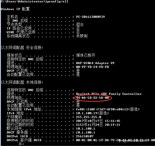 2、找到本機的MAC地址,這個可以在命令行中輸入“ipconfig/all”來進行查詢。找到當前網卡地址。