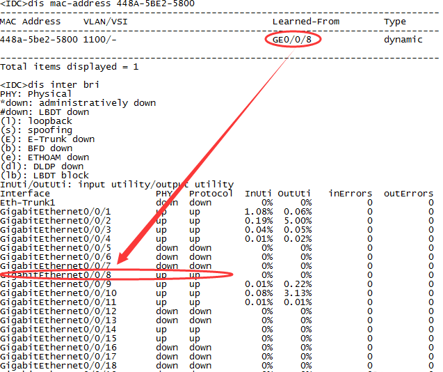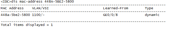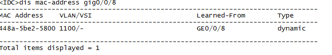 3、之后我們在交換機中輸入命令“dis mac-address 448A-5BE2-5800”,我們就可以查到這個mac地址所對應的端口。