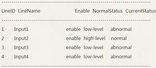 如果輸出線路與輸入線路的邏輯關系為:output1=input1,即當input1異常時,output1連接的報警器發出報警。假設input1的正常狀態為高電平,則用戶可以通過命令配置