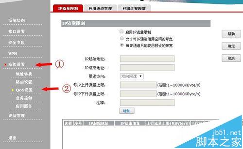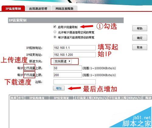 4、在IP流量限制界面,勾選啟用IP流量限制,填寫起始IP,限速為雙向限速(意思是下載和上傳都限制),設置你想限制的最高上傳速度和最高下載速度。