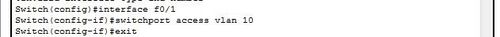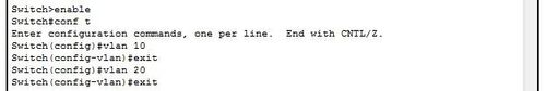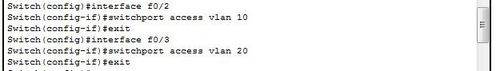 4、在二層交換機上將F0/1口和f0/2口劃分到VLAN 10中。將F0/3口劃分到VLAN 20中。命令如圖所示: