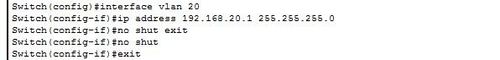 7、在三層交換機的接口f0/1上創建虛擬接口vlan10和vlan 20。并且配置三層交換機的配置vlan10和vlan20虛擬接口的ip地址。