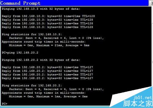9、在pc0上通過cmd去ping pc1和pc2都能連通。
