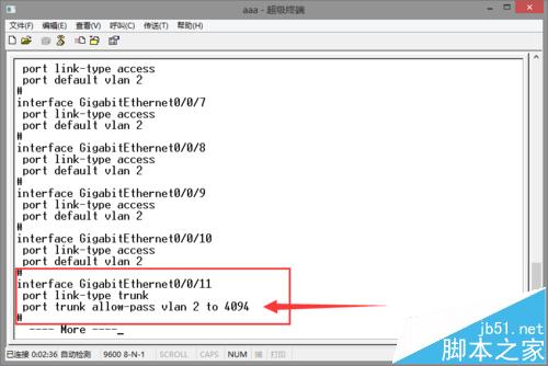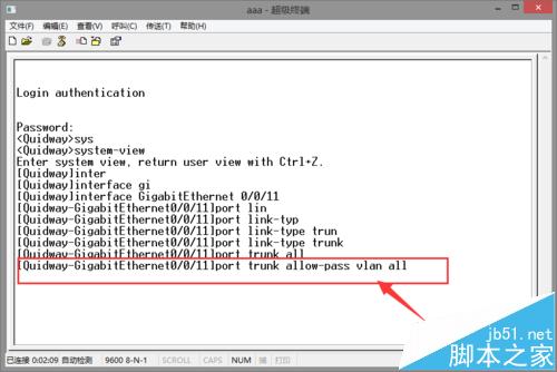 8、配置trunk允許通過的vlan,[Quidway-GigabitEthernet0/0/11]port trunk allow-pass vlan all