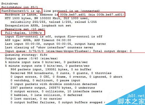 4、在接口信息中相關信息較多,包括接口是否啟用(up or down),該接口的MAC地址,該接口是全雙工還是半雙工(Full-duplex or Half-duplex ),這里的f0/1的接口是處于啟用狀態(up),并處于全雙工(Full-duplex)。