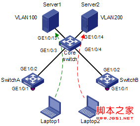 19.6.4 手動配置靜態MAC VLAN配置示例 本示例拓撲結構如圖19-11所示。SwitchA和SwitchB的GigabitEthernet1/0/1端口分別連接到兩個會議室,Laptop1和Laptop2是會議用筆記本電腦,會在兩個會議室間移動使用。Laptop1和Laptop2的MAC地址分別為000d-88f8-4e71、0014-222c-aa69。使用時,Laptop1和Laptop2要分別用于兩個部門的員工,兩個部門間使用VLAN100和VLAN200進行隔離。現要求這兩臺筆記本電腦無論在哪個會議室使用,均只能訪問自己部門的服務器,即Server1和Server2。