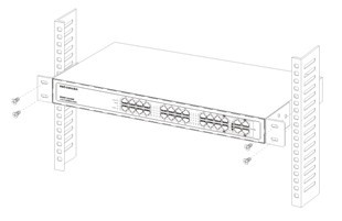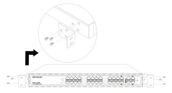 首先,需要將包裝箱內已提供的上機架的配件用與其配套的螺絲固定在交換機的前面板的兩側,然后,再用螺絲將交換機安裝在19英寸的機架內
