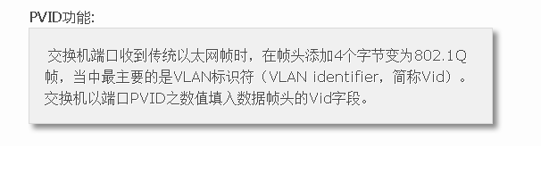 交換機端口收到傳統以太網幀時,在幀頭添加4個字節變為802.1Q幀,當中最主要的是VLAN標識符(VLANidentifier,簡稱Vid)。交換機以端口PVID之數值填入數據幀頭的Vid字段。