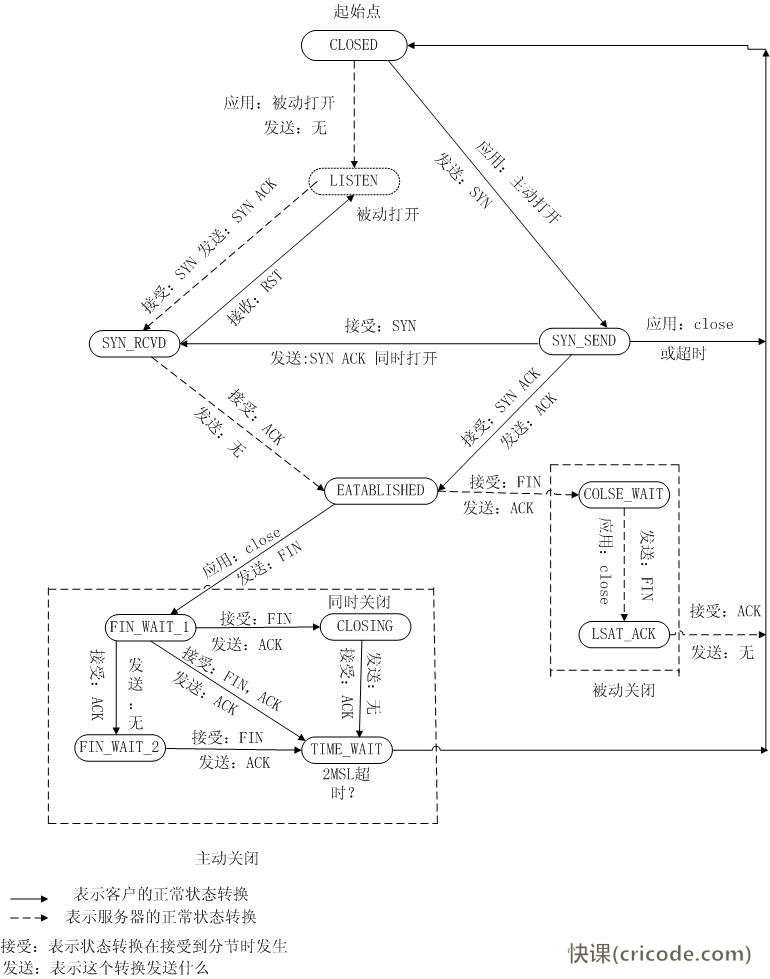 圖2給出了TCP通信過程中的狀態(tài)轉(zhuǎn)移圖,理解此圖是我們理解TCP-IP協(xié)議的關(guān)鍵。
